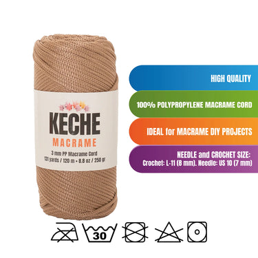Keche Macrame Rope is made from 100% high-quality polypropylene, ensuring a thick, soft, and durable texture. Each skein weighs 8.8 oz (250g) (±10%) and measures 317 ft / 131 yards (120 meters) (±10%) with a 3mm thickness, making it perfect for a variety of crafting projects.
