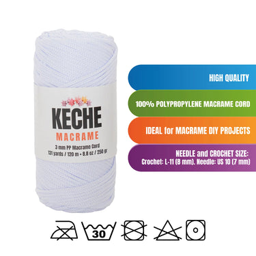 Keche Macrame Rope is made from 100% high-quality polypropylene, ensuring a thick, soft, and durable texture. Each skein weighs 8.8 oz (250g) (±10%) and measures 317 ft / 131 yards (120 meters) (±10%) with a 3mm thickness, making it perfect for a variety of crafting projects.
